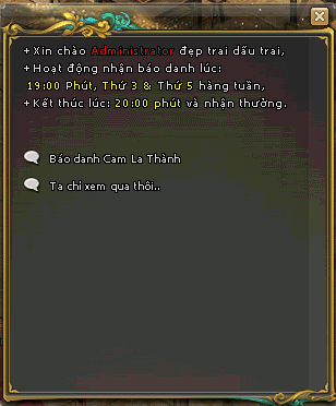 - Hoạt động Khiêu Chiến Cam La Thành diễn ra lúc: 19H00 mỗi Thứ 3 & Thứ 5 hàng tuần.
