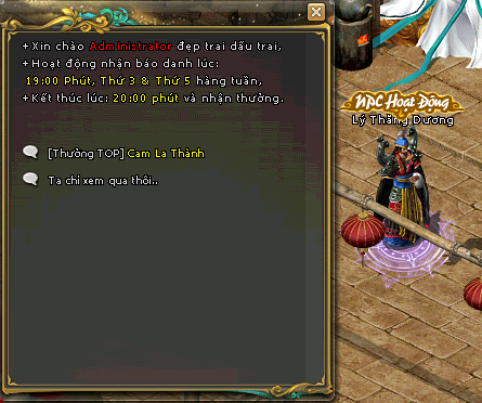 - Bang Chủ cần ghi danh tại: NPC Lý Thăng Dương mỗi khi hoạt động mở báo danh để Bang có thể tham gia chinh chiến.