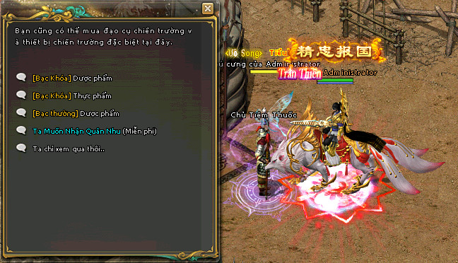 - Sau khi vào doanh trại tập trung, quí nhân sĩ đối thoại npc Chủ Tiêm Thuốc để nhận miễn phí Rương Thuốc sử dụng cho chiến trường.