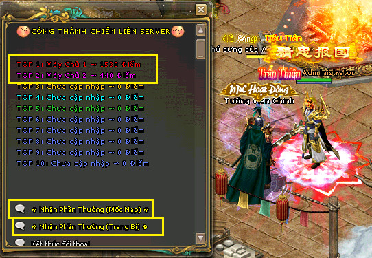 - Trong quá trình tham gia Công Thành Chiến Liên Server khi nhân sĩ chiếm Long Trụ và Ngai Vàng hoặc tiêu diệt quân địch sẽ nhận được số điểm tích lũy nhất định cho máy chủ của bạn.