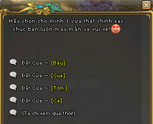 - Sự kiện Cá Cược Bầu Cua hàng ngày mở từ 18h00 đến 18h50, Khoảng cách cứ mỗi 5 phút hệ thống sẽ nhận cá cược tại NPC Tăng Lão Đại và hệ thống sẽ trao thưởng trực tiếp vào nhân vật nếu trúng giải!.