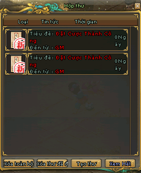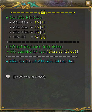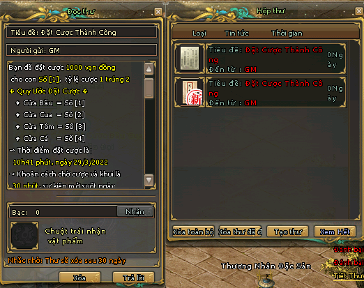 - Sau khi quí đồng đạo cá cược thành công, hệ thống sẽ gửi thư xác nhận, đồng đạo có thể kiểm tra thông tin cá cược trên Hồm Thư Hệ Thống hoặc đối thoại trực tiếp NPC Tăng Lão Đại tại thành chính.